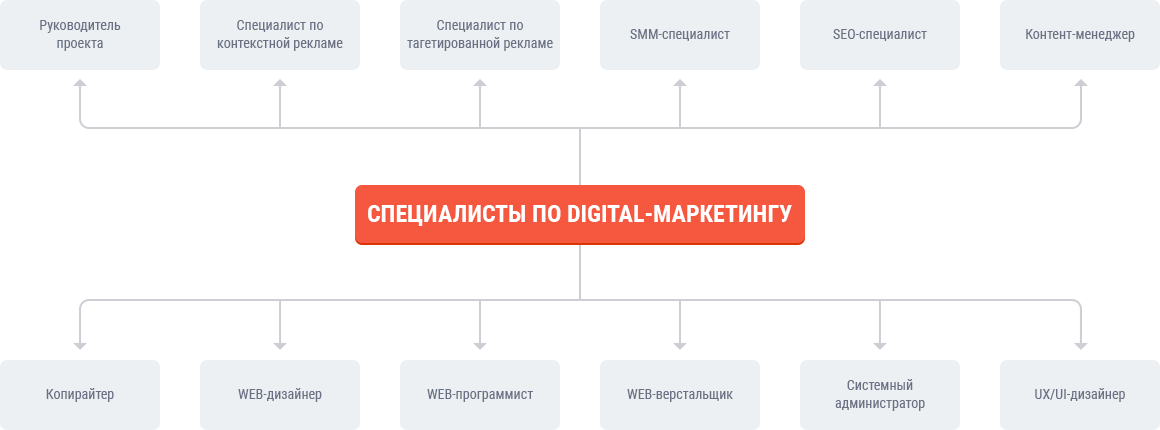 - Руководитель проекта - Специалист по контекстной рекламе - Специалист по тагетированной рекламе - SMM-специалист - SEO-специалист - Контент-менеджер - Копирайтер - Web-дизайнер - Web-программист - Web-верстальщик - Системный администратор - UX/UI-дизайнер